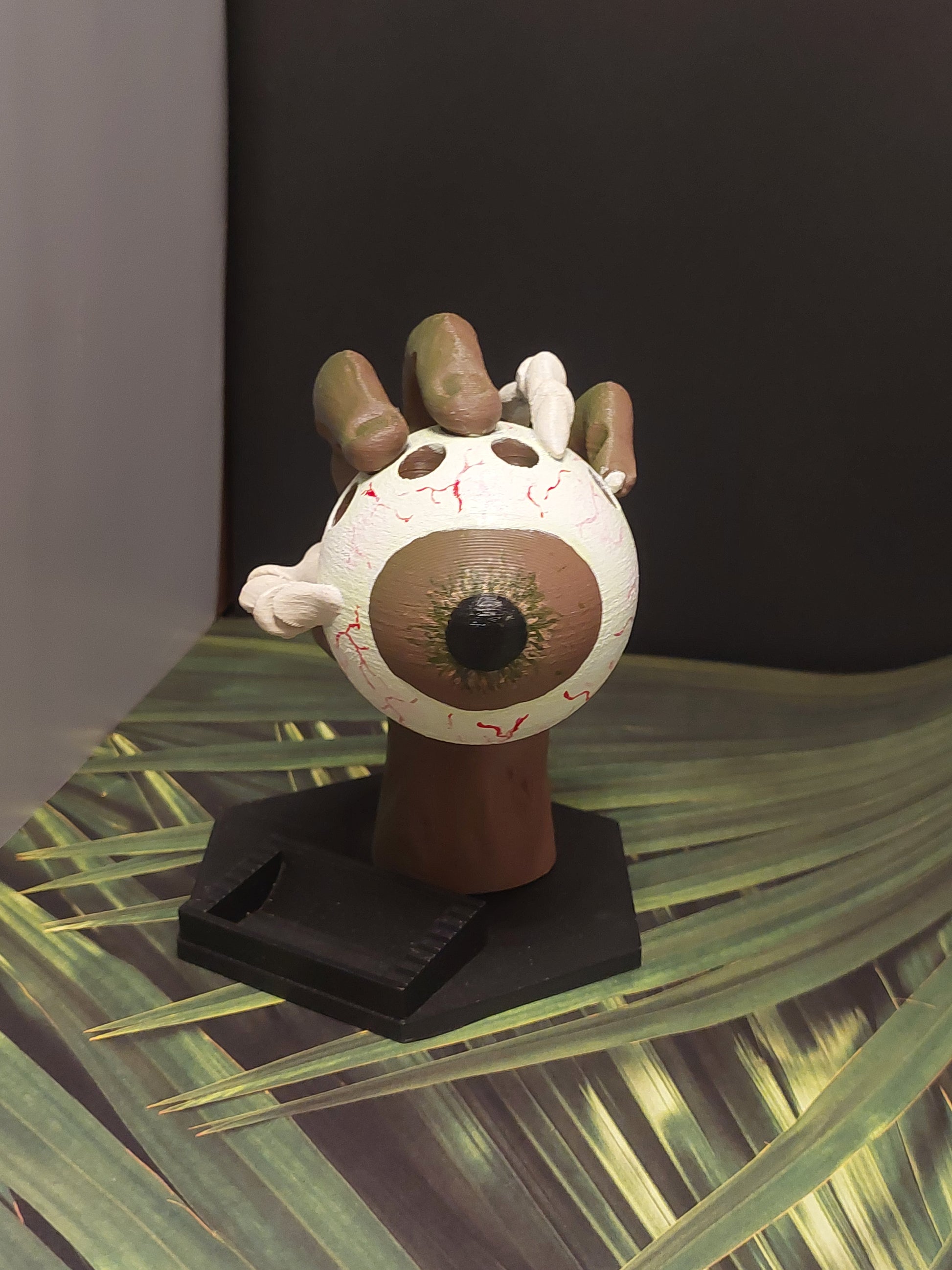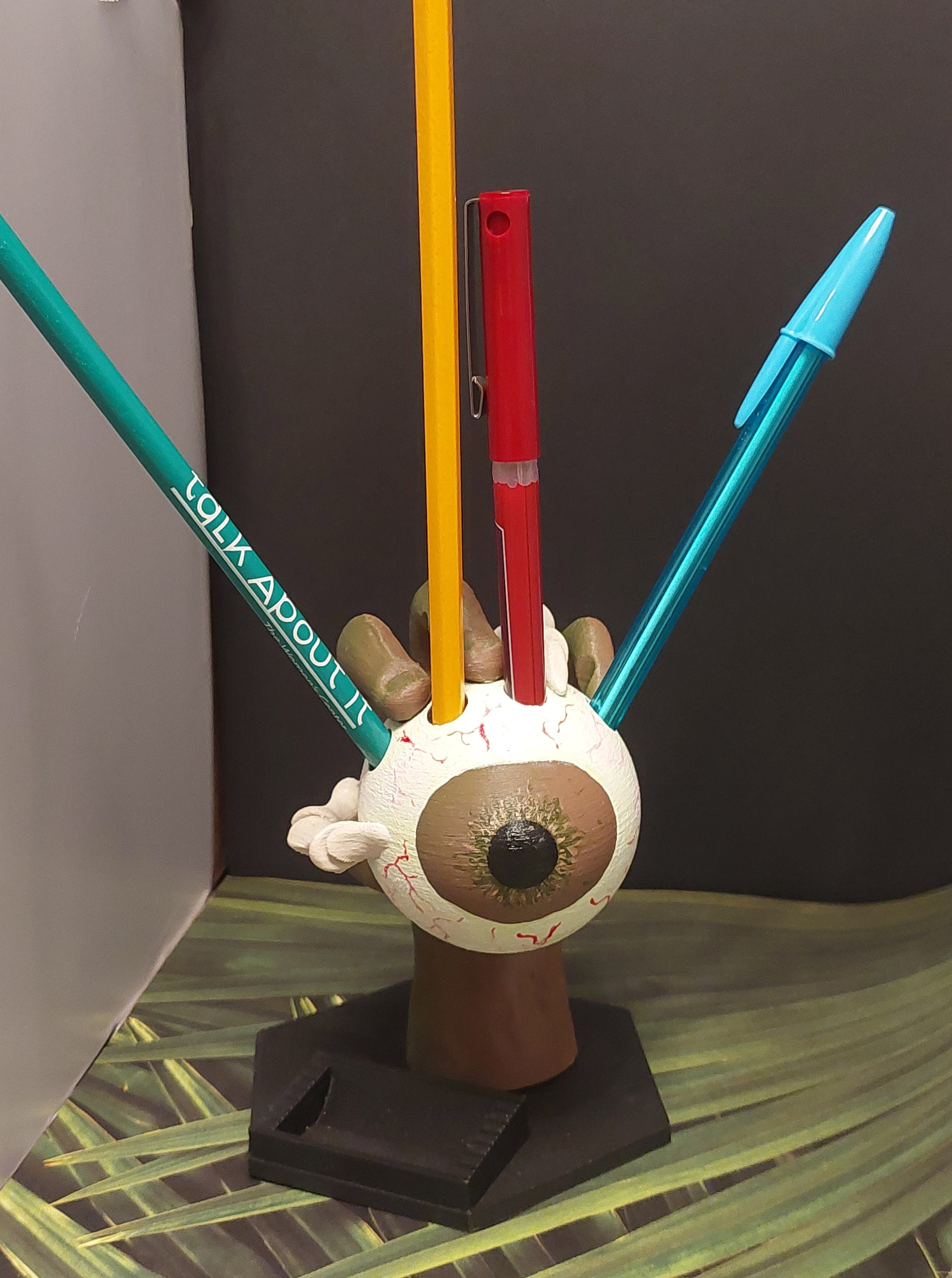 Organize your desk with the Eye of the Beholder! This versatile holder includes space for pens, makeup brushes, or paint brushes. Plus, each one is hand painted for a unique touch. Get creative and declutter with style.